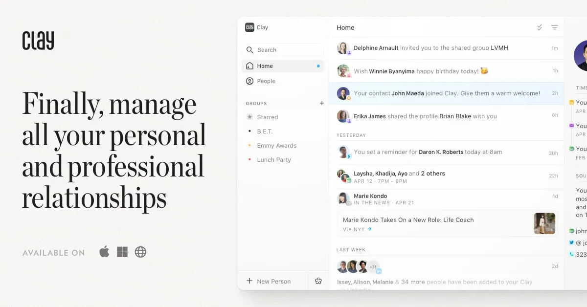 Introducing Clay, the beautiful and private home for all your relationships. Populated from the ground up using your calendar and social history, Clay is the most stunning, powerful way to remember who you’ve met—and what matters to them.