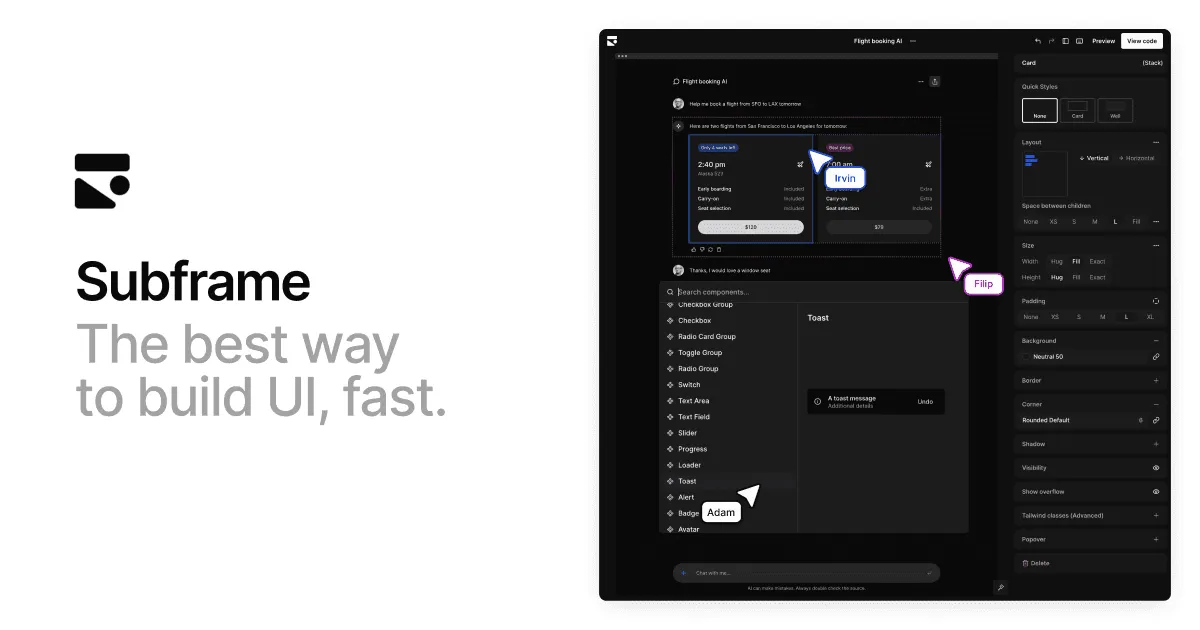 Subframe lets you visually design your product and export it as React code. It's the design-to-code tool that's loved by teams.